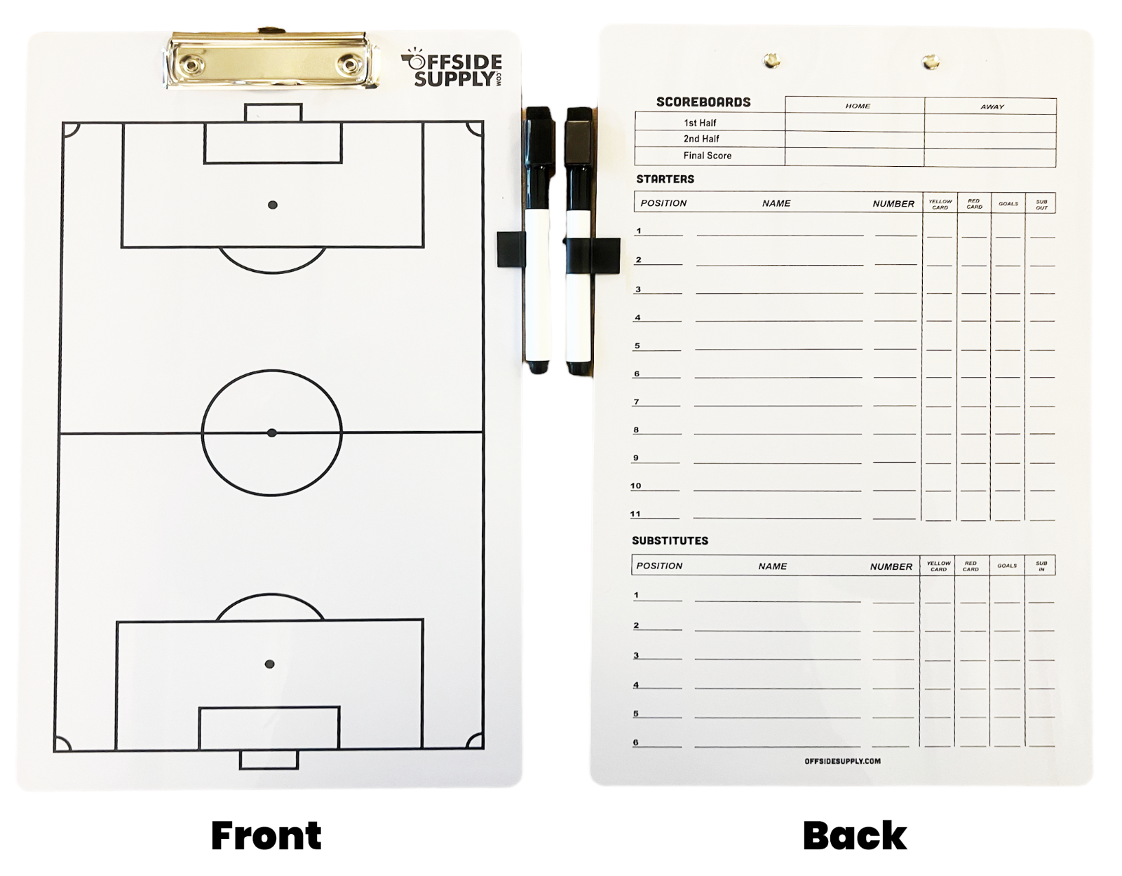 Introducing our double-sided soccer dry erase board for soccer coaches. Designed to enhance your coaching experience. On the front side, you'll find a complete and accurately proportioned soccer field, with clear lines to visualize game strategies. The reverse side offers a convenient layout for managing your team players, with sections for subbing in and out, as well as tracking game progress.